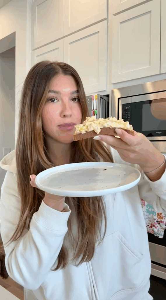 It’s only 295 calories and packs in 33 grams of protein, which means it keeps me full all afternoon without that heavy, weighed-down feeling. This is my go-to when I want something nourishing but simple. There’s no cooking required other than toasting a slice of bread.